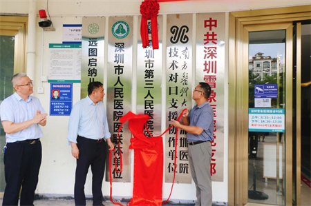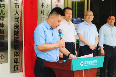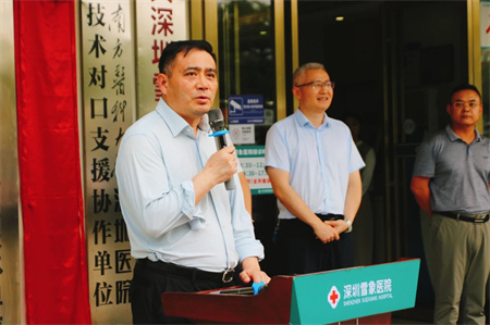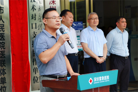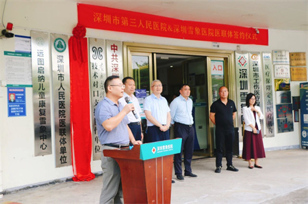 揭牌仪式由深圳雪象医院院长郭朝雷主持,他首先介绍了各位参会嘉宾,向深圳市第三人民医院的领导、专家的到来表示欢迎和感谢。他在欢迎词中动情表示:在深圳市第三人民医院的帮助下,在两院同仁的携手努力下,将医联体建设做实、做细、做出成效,一定能把雪象医院打造成以适宜技术为引领,优质医疗服务和卓越口碑的政府满意、群众认可、员工满意的医院。